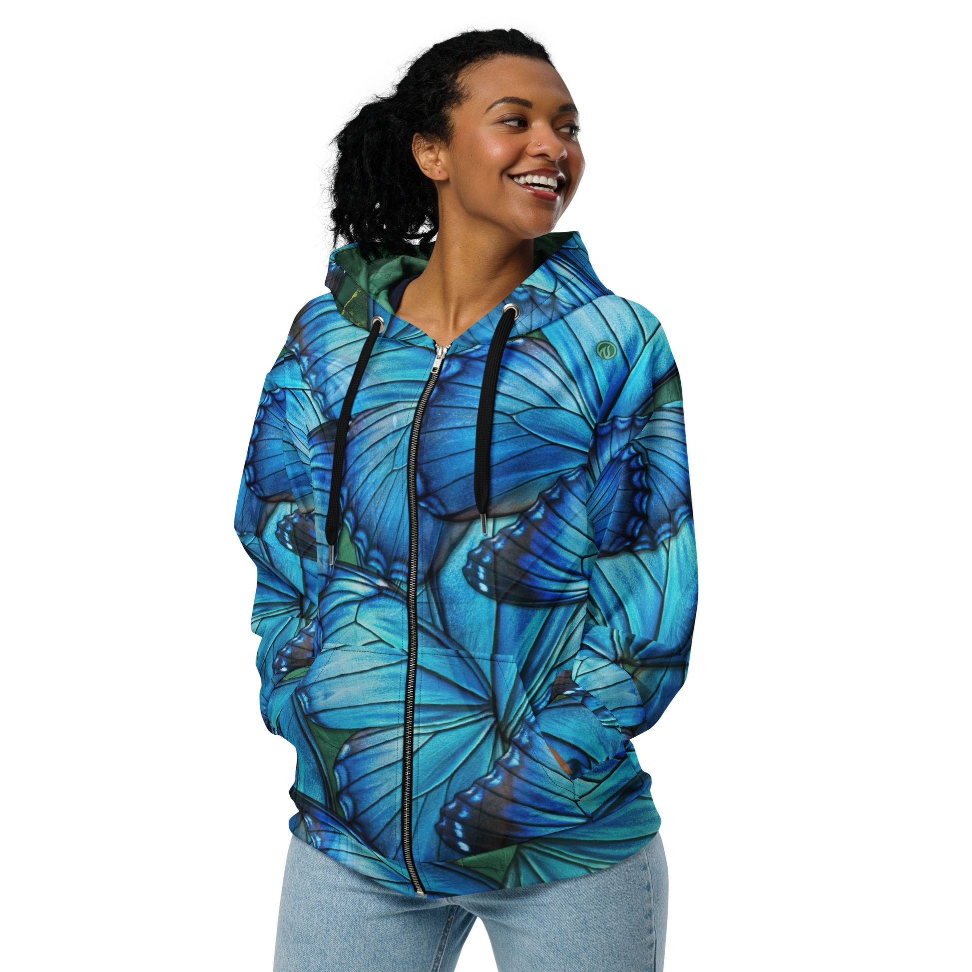 Inspired by the iridescent Morpho butterfly — said to a grant a wish if seen — this vivid blue front zip hoodie brings energy, confidence, and effortless movement. We love butterflies because they symbolize the ability to transform yourself.