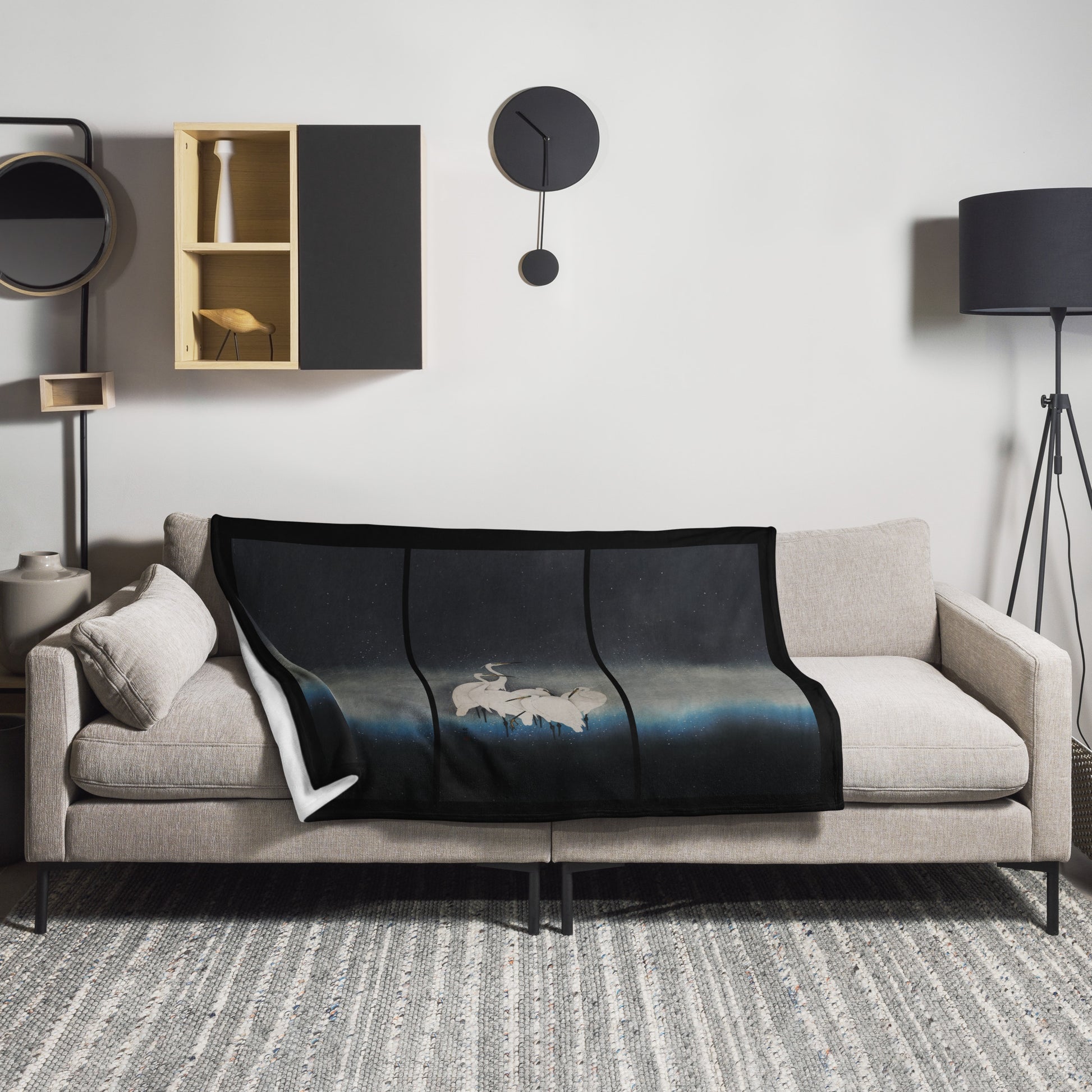 The falling snow, mist, the hint of turquoise blue to indicate water... all so beautifully wintery, this is the perfect piece for starting off the new season. This wonderfully soft, cozy blanket features art from a woodblock print by Japanese Artist Ohara Koson from 1927.