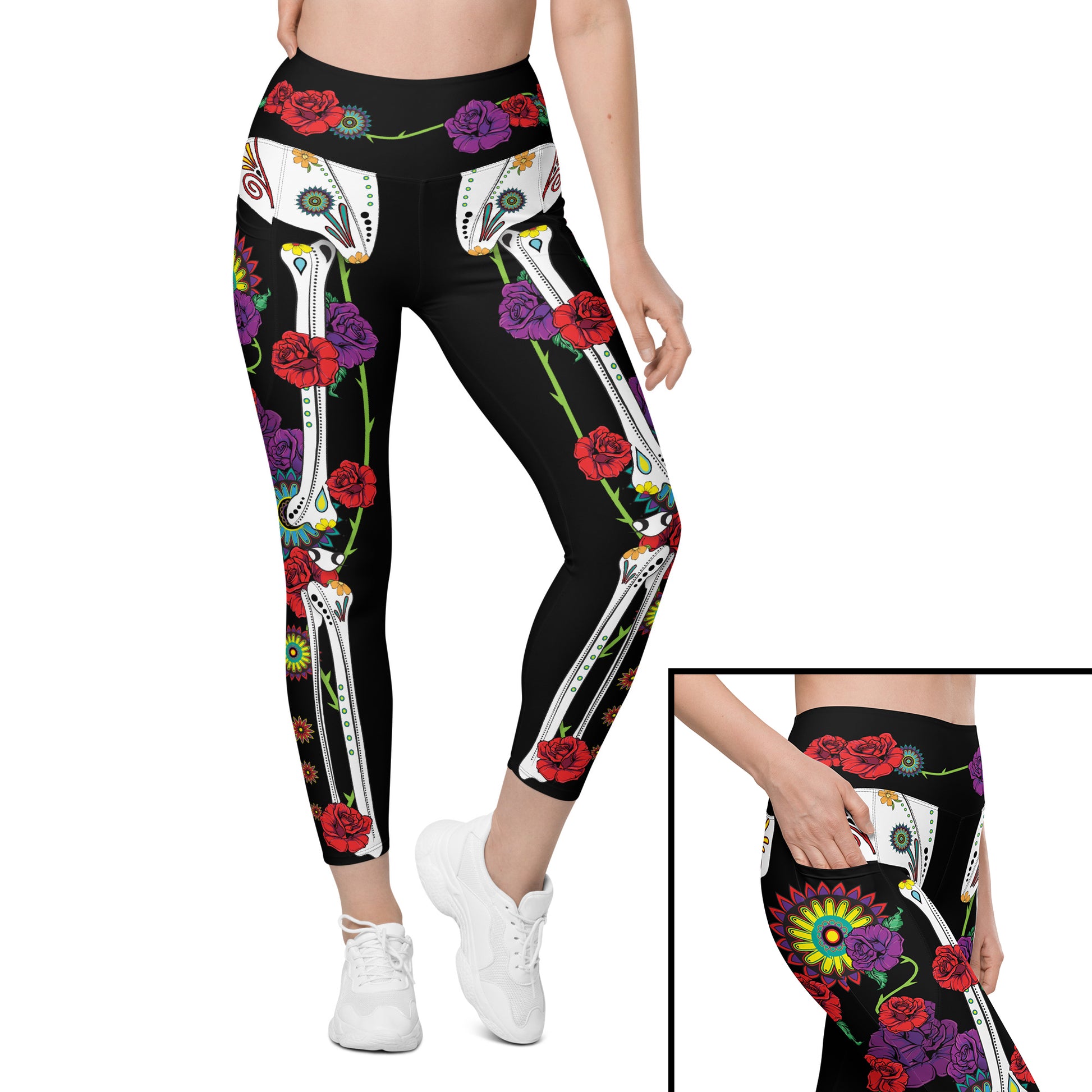 These tights with pockets feature vibrant Día de los Muertos-inspired bones and florals that dance around your legs. Great for Halloween but so fun, you'll enjoy wearing them year around!